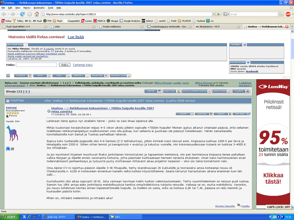 Kaikki alkoi yhdestä viestistä relaa.com forumilla. Retkikunnan puuhamies Teemu Saarikivi laittoi foorumille viestin, jossa kyseltiin retkikuntaprojektiin kiinnostuneita. Teemulla ei ollut kokemusta retkikuntatouhuista, mutta vuorilla oli tullut käytyä. Myös allekirjoittaneella oli sama tilanne. Loppujen lopuksi mukaan saatiin myös viisi muuta kaveria, joilla tilanne oli enemmän tai vähemmän sama. Tämä kirjoitus on kirjoitettu vajaa vuosi matkan tekemisen jälkeen. Olen käyttänyt kaikkia mahdollisia muistikuvia, valokuvia, retkipäiväkirjaa ja aikaisemmin kirjoittamiani artikkeleita asiasta. Tarkoituksena on muodostaa kattavampi kuva meidän projektista sekä tarjota tietoa vastaavanlaista projektia suunnitteleville. Näkökulma on kuitenkin puhtaasti minun, muut reissussa olleet saattavat olla, ja tietyistä yksityistä kohdista varmaan ovatkin, eri mieltä. Ryhmän muodostaminen ja kohteen valinta. Hankkeen alullepanijana Teemu muodosti ryhmän ympärilleen. Suurin osa meistä oli toisillemme täysin tuntemattomia. Muutama toisensa tunteva osui mukaan suunnitteluryhmään ja joidenkin nimet olivat tuttuja, mutta itse kaveria ei varsinaisesti tunnettu. Alunperin mukaan ilmoittautui reilut 20 kiinnostunutta. Tämän porukan kanssa sitten keskusteltiin mahdollisesta ajankohdasta ja kohteesta. Vaihtoehtoina olivat muiden muassa yli 7000 metriä korkean vuoren kiipeäminen, tutkimusmatkailu Kiinan länsiosiin ja aikaisemmin kiipeämättömien yli 6000 metriä korkeiden huippujen kiipeäminen aivan läntisimmässä Kiinassa. Kohde valittiin lähinnä sillä perusteella, että jos haluaisimme kiivetä neitseellisiä kuustonnisia, niin se olisi parasta tehdä nyt juuri tuolla. Joka vuosi näitä huippuja kiivetään lisää ja lopulta jäljelle jäävät vain kaikkein vaikeimmat ja vaikeakulkuisimmat huiput. Siihen asti ei kannattaisi odottaa, koska silloin tämä haave jäisi todennäköisesti saavuttamatta. Toinen syy oli se, että monille suomalaisille tuttu ja hyvässä maineessa oleva Andrey Ershov tarjosi palvelua tällaiselle paketille. Luonnollisesti retkikunnan osuus suunnittelussa ja toteutuksessa olisi merkittävä, koska seutu olisi myös Andreylle uusi tuttavuus. Tämä pioneerityö tuntui kiehtovalta ja siihen tartuttiin. Ilmeisesti projektimme tuntui myös Andreystä kiehtovalta, koska hän liittyi meidän seurueeseemme ja kiipesikin kanssamme yhdelle huipulle. Kohteen valinnan jälkeen valikoitui pienempi joukko ihmisiä, jotka olivat kiinnostuneita retkikunnasta. Retkikuntaan sitoutumiseksi sovittiin 300 euron sitoutumismaksu. Tämän maksun maksoi yhteensä 12 henkilöä, joista siis loppujen lopuksi 7 pääsi matkaan. 300 euroa oli siinä mielessä hyvä sitouttamismaksu, että näillä viidellä sitouttamismaksulla saatiin katettua suurinpiirtein ryhmän pienentymisestä johtuva matkan kallistuminen. Toisaalta, 300 euroa ei ole niin suuri maksu, että kenenkään talous kaatuisi, vaikka sen menettäisi. Olen varma, että menetettyä 300 euroa enemmän harmittaa menetetty tilaisuus, mutta aina kaikki ei mene niinkuin alun perin on käsikirjoitettu ja syyt olivat sen verran painavia, että retkikunnasta luopuneet joutuivat varmasti harkitsemaan projektin ja muun elämän välillä, ei niinkään menetetyn rahasumman kohtaloa. Projekteinahan retkikunnat ovat kalliita, mutta ennenkaikkea aikaa vieviä. Matkan valmistelu Suurin osa matkan valmistelusta on perinteistä retkikuntatyötä. Käydään varusteluetteloa lävitse, hankitaan puuttuvia varusteita, valitaan lentoreitti, suunnitellaan rahditus, pohditaan julkisuusaspekti, hankitaan tarvittavat luvat ja viisumit jne. Pieni osa suunnittelusta oli itse kiipeilyn suunnittelua. Näiden lisäksi tarvitsimme harjoittelua, jossa suurta osaa näytteli toisiimme tutustuminen. Kävimme porukalla viikon reissussa Alpeilla, pari kertaa jääkiipeilemässä Helvetinjärvellä sekä lukemattomia kertoja lähikallioilla, jääputouksilla ja lenkkipoluilla. Toisinaan kuulee sanottavan, että armeijasta saa elinikäisiä ystäviä. Itse en kyllä saanut ainoatakaan, mutta olen varma, että tästä reissusta joka jätkän muistaa vielä kiikkustuolissakin, jos siihen saakka näillä harrastuksilla elää. Elo-syyskuussa 2006 retkikunta siis harjoitteli ja tutustui toisiinsa Alpeilla. Tarkoituksena oli kiivetä Grand Combin nimiselle vuorelle, joka sijaitsee Valaisin kantonissa Sveitsissä. Retkikuntaan osallistuineista mukana matkalla oli Mikko Piironen, Teemu Saarikivi, Henri Arjanne, Lauri Hämäläinen, Rauno Ravantti ja Veli-Matti Helke. Retkikunnan suorituskyky ei ollut aivan tapissaan, sillä Raunolla oli kunnon flunssa ja Teemun umpisuoli oli sanonut poks hieman ennen reissua. Allekirjoittanut puolestaan sai reissusta elämänsä ensimäisen korvatulehduksen. Kyseessähän on lastentauti, joten aikuistumiseni lienee alkamassa vasta joskus myöhemmin. Grand Combinia lähestyttäessä alkoi lumisade. Lunta tulikin sitten se puoli metriä, ja mitään ei saatu kiivettyä. Pari päivää teltoissa kärvisteltyämme päätimme valua laaksoon nuolemaan haavojamme. Palatessa jäätiköllä oli paksu lumikerros railojen päällä, joten varovasti GPS:n avustuksella marssimme kohti Panossieren majaa. Sen kävelyn aikana minulle aukeni täysin GPS:n hyöty. Ilman kyseistä laitetta, matka olisi kestänyt varmasti pari tuntia pidempään. Lienee kohtalon ironiaa, mut paluumarssin aikana aurinkokin alkoi paistamaan. Päätös oli kuitenkin tehty ja palasimme majoitukseen saunomaan. Tämän jälkeen Henri ja Lauri suuntasivat takaisin Chamonixiin, josta olivat matkaamme tulleetkin. Muut jatkoivat Weissmiesille, joka on jonkin verran itäänpäin Grand Combinista. Tämän vuoren päälle päästiinkin perusreittiä pitkin hyvässä säässä. Kiipeilyllisesti reissu ei siis ollut menestys, mutta oltiinpahan päästy näkemään kauniita maisemia. Ja ensimmäistä kertaa toisemme ryhmässä. Ainoa lopullisen retkikunnan jäsen, joka pu
