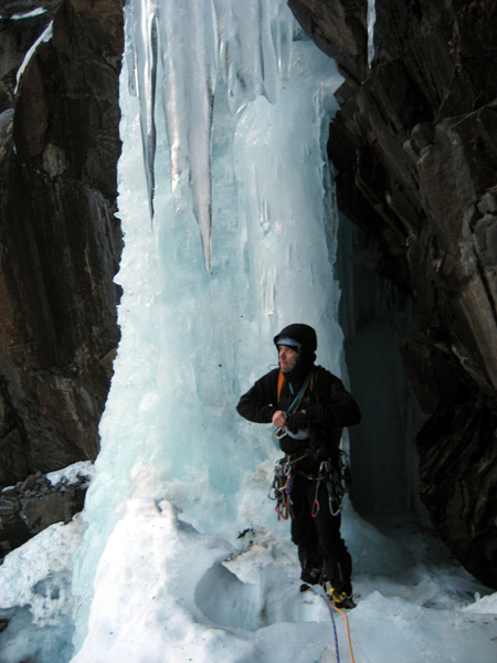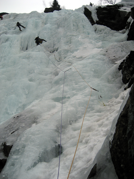 kiipeämisen jälkeen. Molemmat reitit ovat kuitenkin kolme köydenpituutta ja vaikeutta on WI5:n verran.